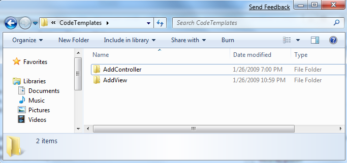 The “AddController” sub-folder contains the scaffold template for the “Add Controller” dialog. The “AddView” sub-folder contains the scaffold templates for the “Add View” dialog: